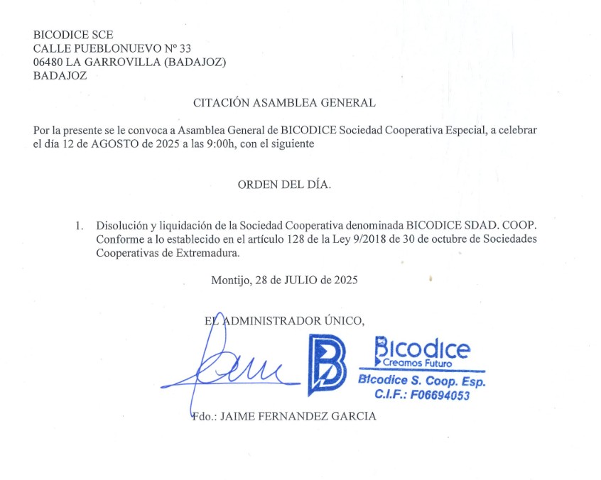 Informamos a nuestros socios y partes interesadas que se ha convocado una Asamblea General de BICODICE Sociedad Cooperativa Especial para el próximo 12 de agosto de 2025 a las 9:00h, con el fin de tratar el siguiente orden del día: